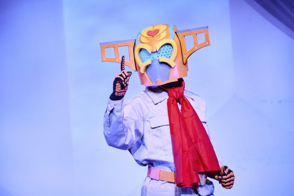 ぱちぱち発のご当地ヒーロー、多摩ニュータウンマンによる歌&ダンスパフォーマンスだ!