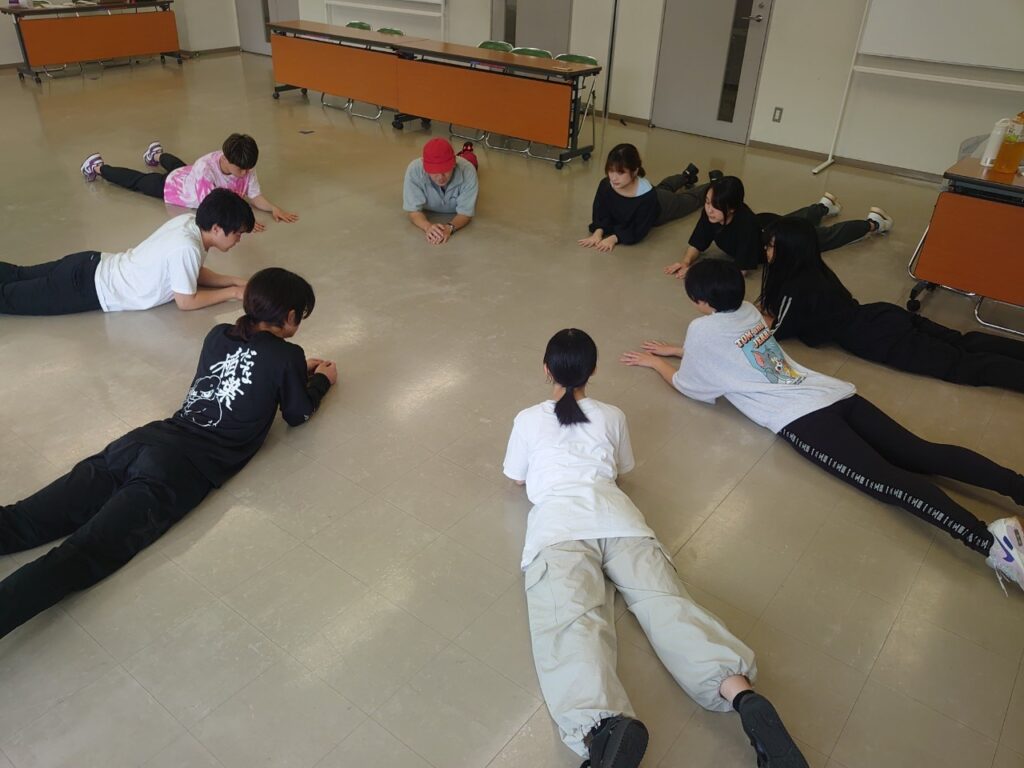 稽古前の時間では、ぱちぱちメンバーのリードによるアップ(身体をほぐしたりして稽古にスムーズに入れるようにするもの)を行い、親睦も深めた。