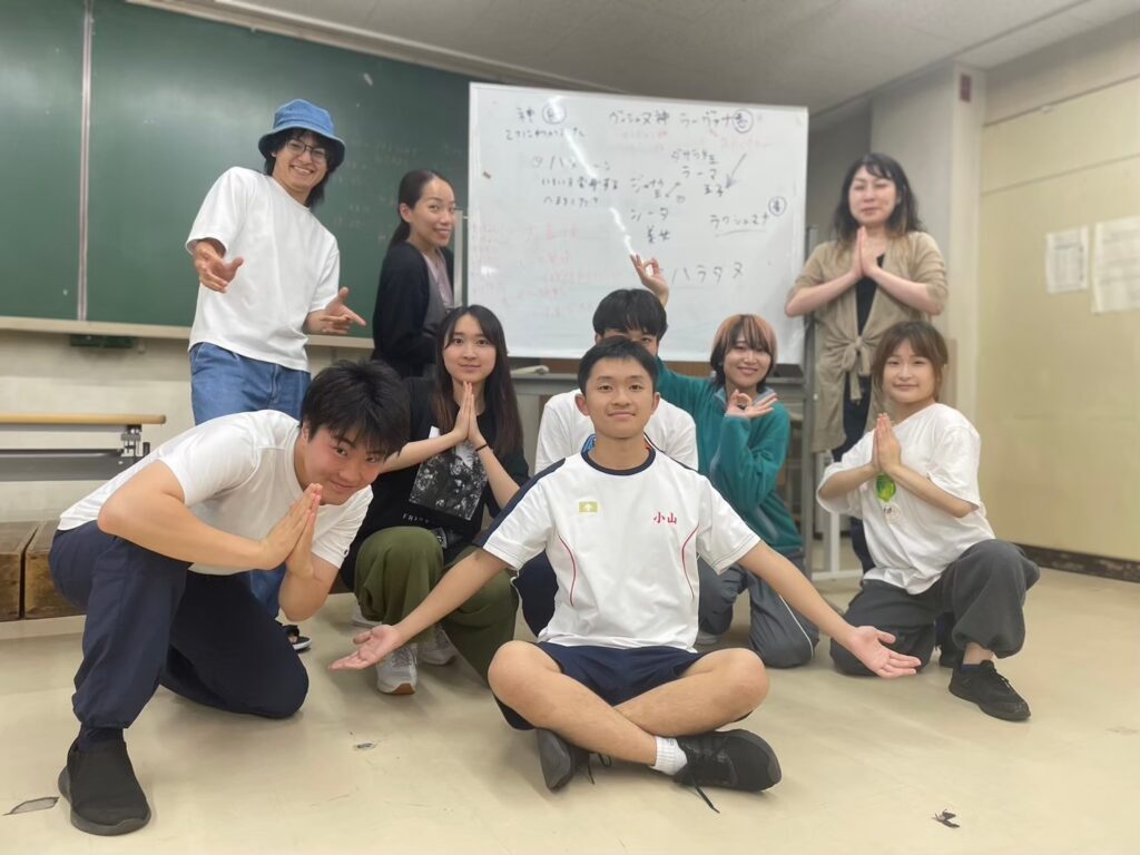 ▲ダンサーの木皮成さん、演出の早坂彩さん、中込遊里、ぱちぱちメンバーのみんなと高校生。『ラーマーヤナ』の理解をしつつ身体を動かす稽古の日。