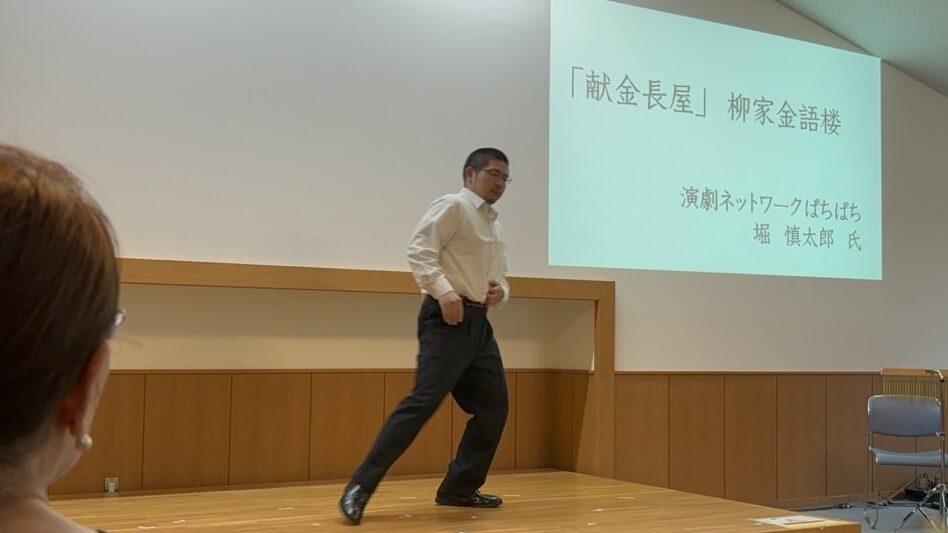 当日は70人程のお客さんが見守る中、堀さんは20分間見事に演じきりました。登場人物が一人一人演説していくという演目の構造が当日の会場の構造に上手くハマり、見ている私たちも長屋の住人になったような気持ちになりました。