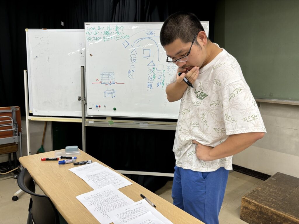 今回上演する『献金長屋』は落語、つまり1人で何人もの登場人物を演じ分けなくてはなりません。しかし1人で稽古するには限界があります。方向性や演技について意見を言ってくれる人がいてほしいという堀さんの希望で、ぱちぱちの運営チームが稽古サポートという立場で稽古場に立ち合いました。