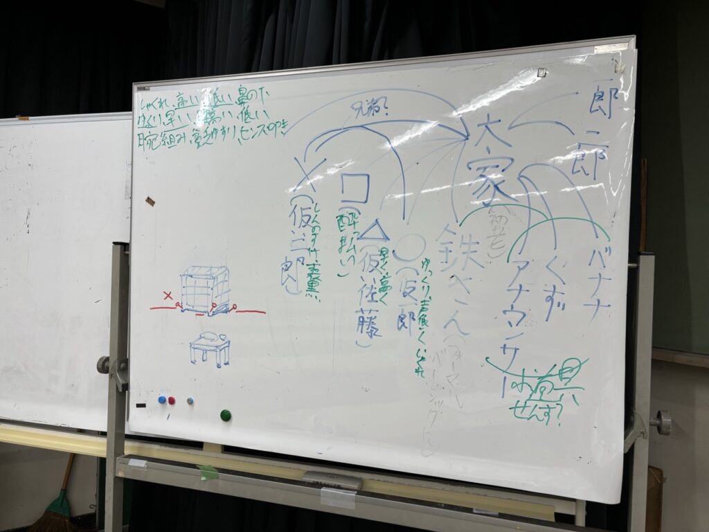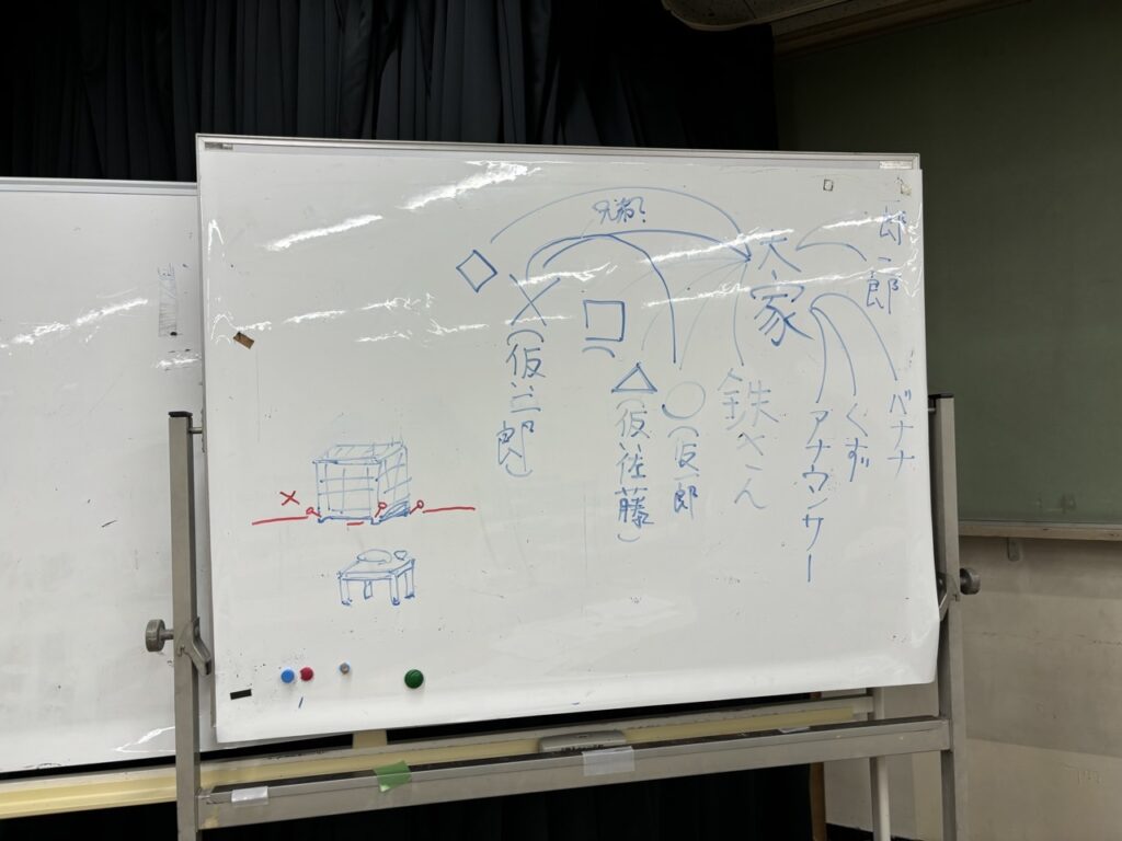 そもそもこの作品に登場人物は何人出てくるのか?というところから稽古はスタートしました。そして、登場人物のキャラクターを細かく演じ分けたらもっと面白くなる!ということで、まず、堀さんが出せる声や動作を書き出して、それらを各登場人物に振り分けていくという作業を行いました。これにより人物ごとに特徴が生まれ、話がグッと分かりやすくなりました。
