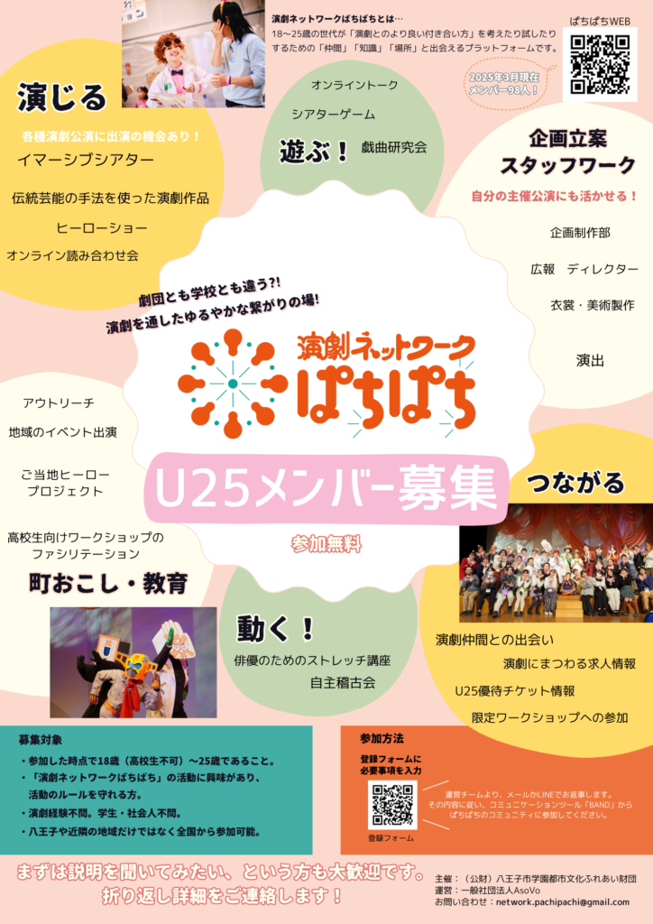 演劇ネットワークぱちぱちは、ユース世代が年間で数多くの企画を行う中で「演劇の様々なあり方」を探求しています。新年度の企画として、ぱちぱちにも新しい出会いが生まれることを願い、「ぱちぱち」らしさを持ったワークショップを開催します。演技の基礎「声・身体・コミュニケーション」をテーマとして、異なる背景を持った俳優の方に講師をお願いしました。私は、ワークショップは「出会いの場」と考えています。演劇の技術や経験値が上がるだけではなく、いろいろな経験や価値観を持った人たちと出会うこと。そして、その出会いを通して自分自身を発見することを目指しています。このワークショップでの出会いが「あなたにとっての演劇」を発見する機会になりますように。