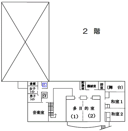 | 2階 | 有料 施設 | 音楽室 | 66㎡ | 30名 | 楽器の練習などにご利用ください。グランド・ピアノあり。 |