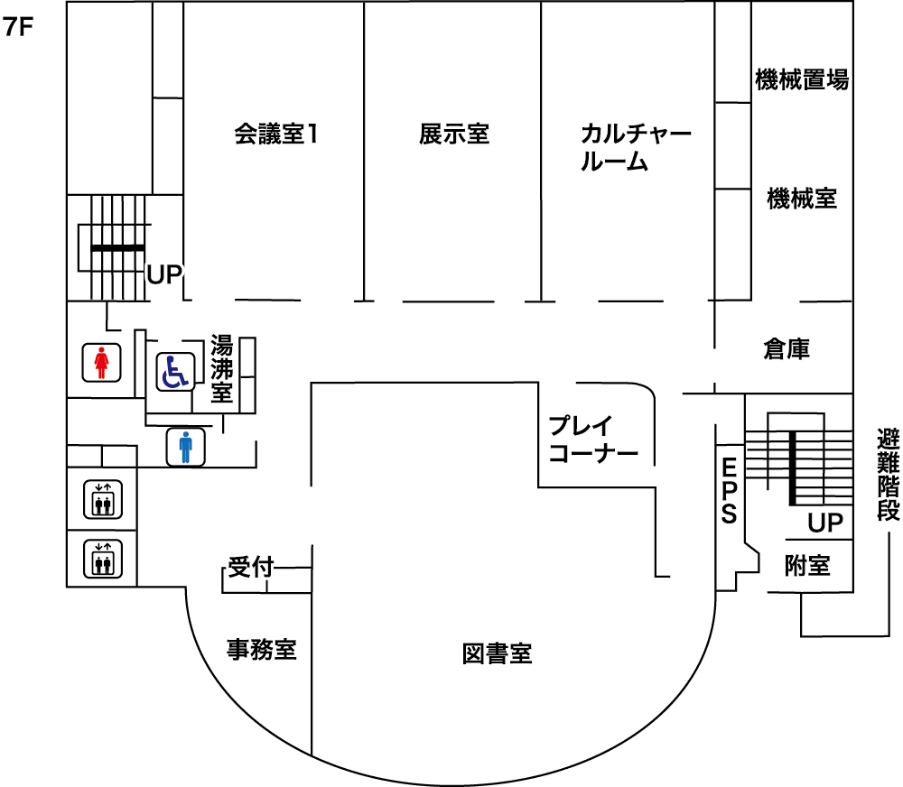 | 7階 | 有料 施設 | 会議室1 | 115㎡ | 99名 | 集会、講演会、映写会などにご利用ください。 |