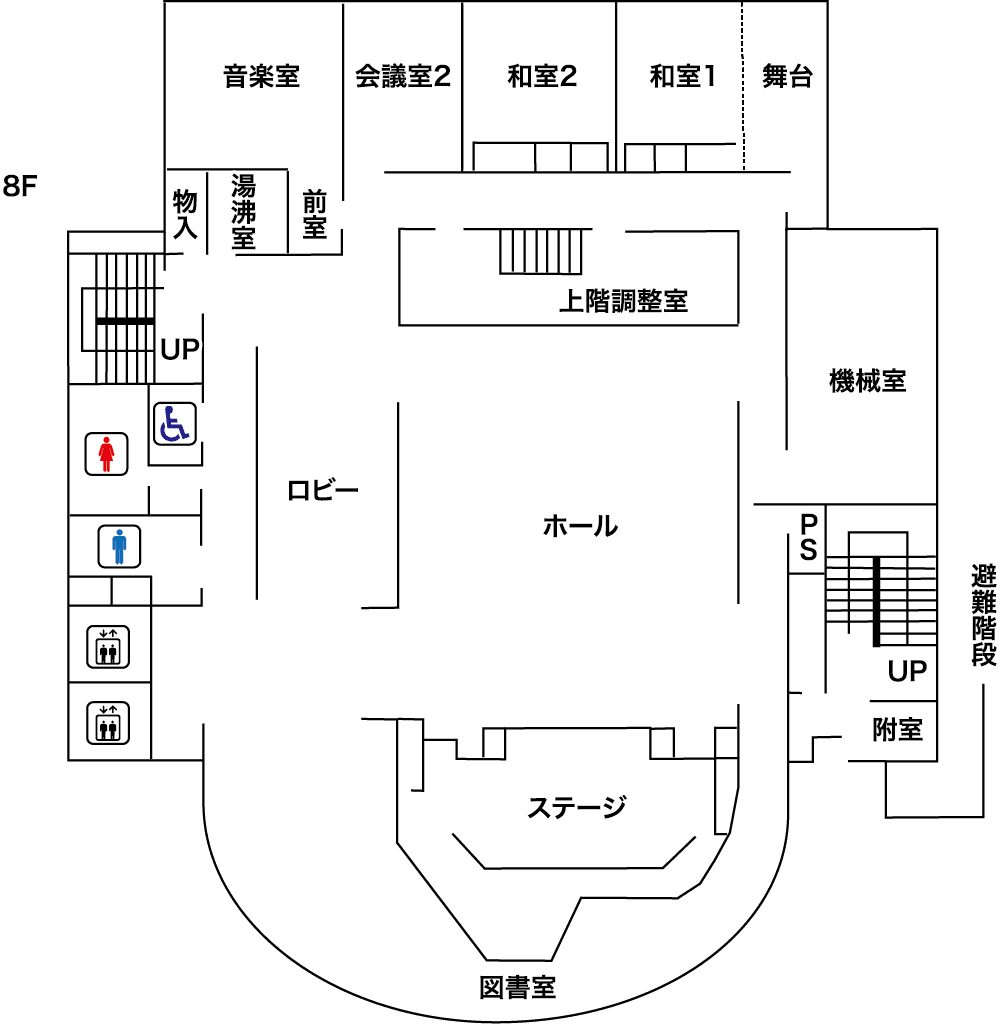 | 8階 | 有料 施設 | 音楽室 | 50㎡ | 30名 | コーラス・楽器の練習などにご利用ください。 |