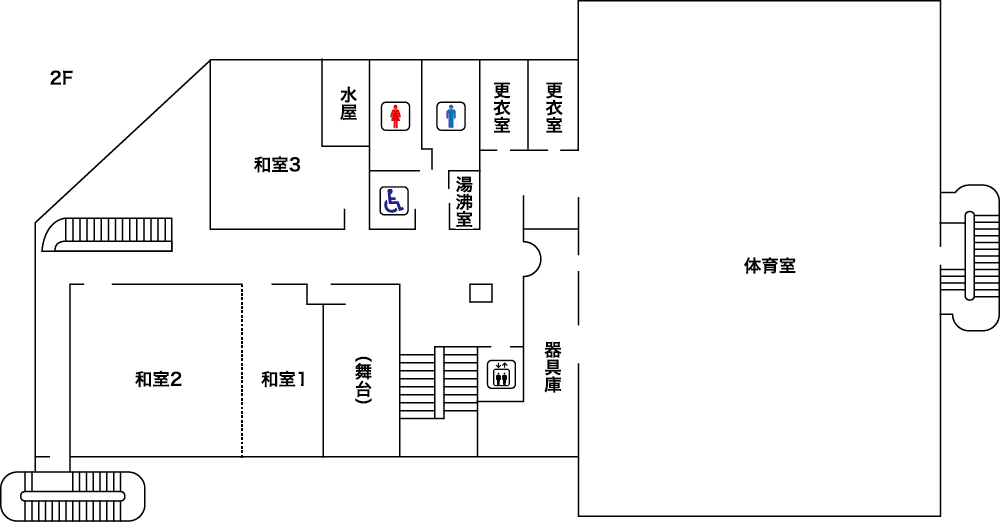 | 2階 | 有料 施設 | 和室1(舞台付) | 24畳 | 72名 | 短歌・句会などの集いや、会議、読書会、踊り等のお稽古の場として、又、囲碁・将棋、趣味の集いにご利用ください。 |