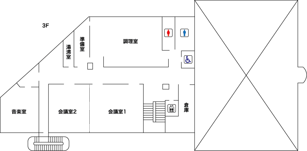 | 音楽室 | 59㎡ | 30名 | コーラス・楽器の練習などにご利用ください。 | ||