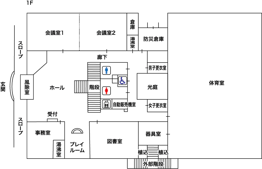 有料 施設 体育室 544㎡ バレーボール・バドミントン・卓球などにご利用ください。 更衣室あり。