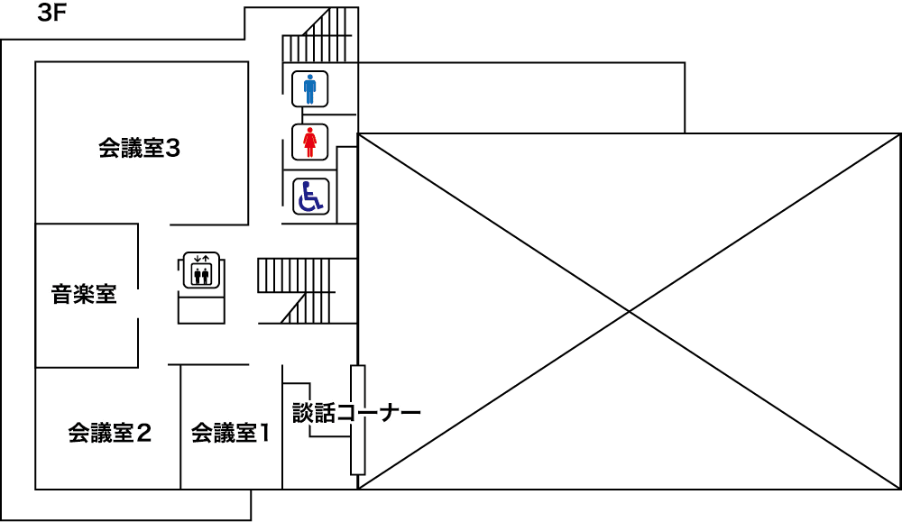 | 会議室3 | 94㎡ | 60名 | 集会、講演会、映写会などにご利用ください。 | ||
