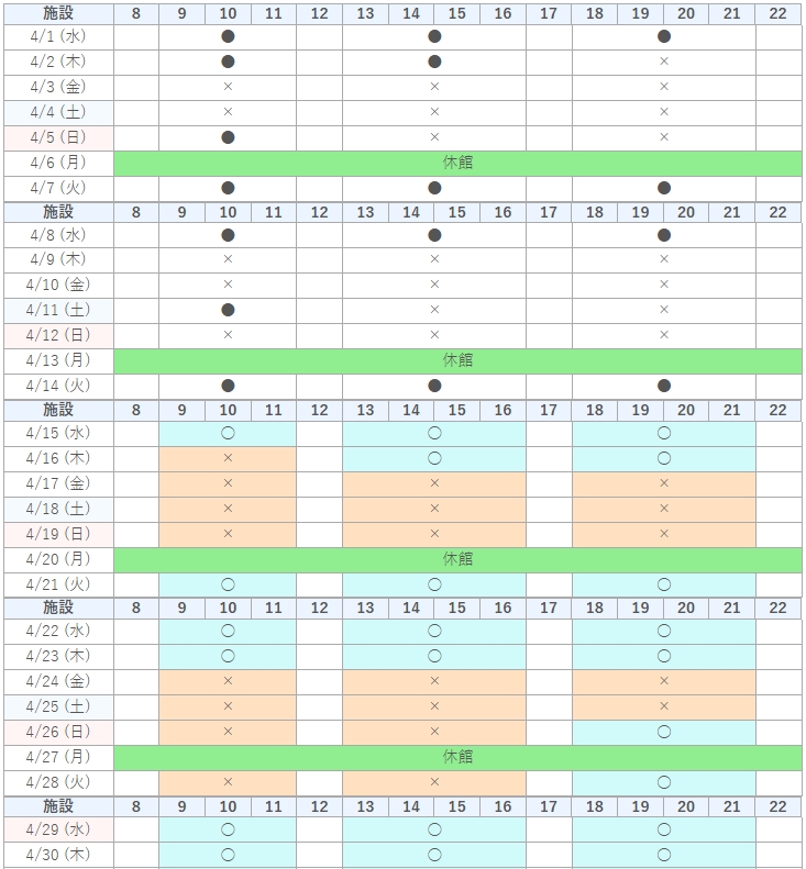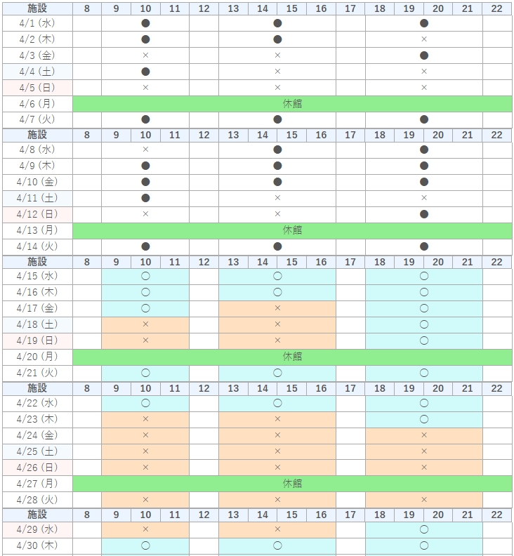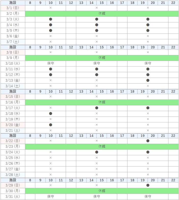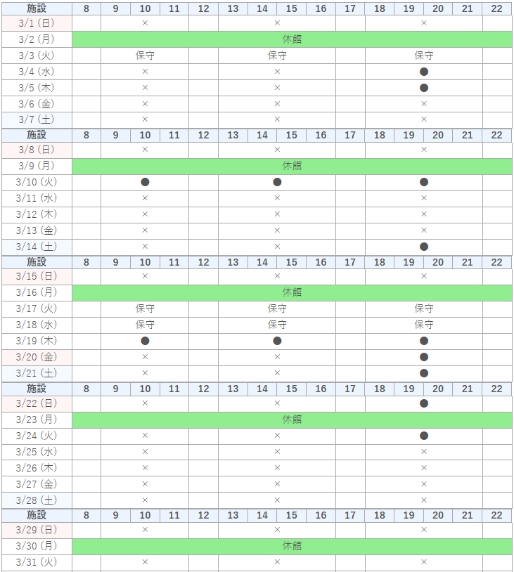 大ホール・小ホール直近の空き状況 2026.02.15 2月15日現在の情報のため、最新の空き情報はこちらからご確認ください。大・小ホールの舞台面や半区分の受付は、お電話・窓口にてお受付け致します。 大ホール 小ホール