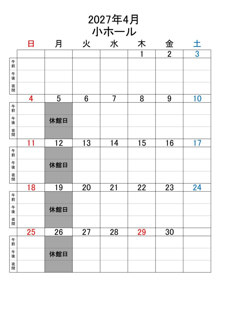 2026年4月1日の抽選会では、ホールのお申込みについては下のカレンダーの