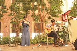 ギターとフルートは音色が合うと思い四年前にユニットを結成しました。朝倉は主催するギター教室の傍ら、小関も仕事や家事と両立させながら、カフェライヴなどの演奏活動をしています。