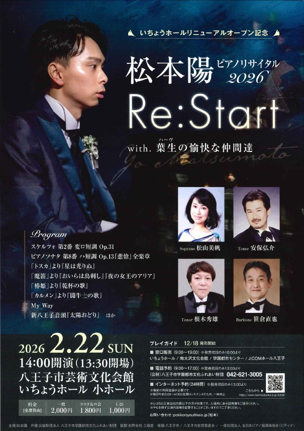 【出演】松本 陽(ピアノ)松山 美帆(ソプラノ)安保 弘介(テノール)根木 秀雄(テノール)笹倉 直也(バリトン) 【曲目】ショパン:スケルツォ 第2番ベートーヴェン:ピアノソナタ 第8番『悲愴』全楽章モーツァルト:夜の…