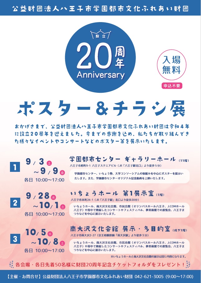 おかげさまで、今年(公財)八王子市学園都市文化ふれあい財団は設立20周年を迎えました。 今までの感謝を込め、私たちが取り組んできた様々なイベントやコンサートなどのポスター等を展示いたします。 【第1回】 日時:9/3(土…